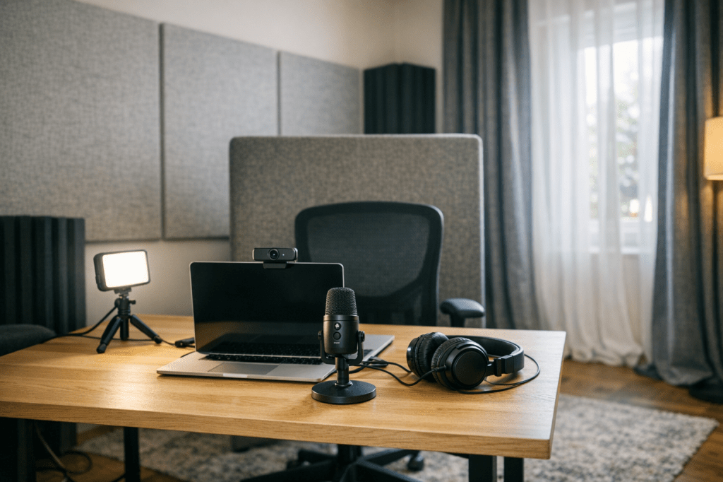 De juiste positionering van je apparatuur maakt een wereld van verschil bij hybride vergaderingen. Plaats je microfoon op ongeveer 15 tot 30 centimeter afstand van je mond voor een helder en natuurlijk geluid, en zet je camera op ooghoogte zodat je gesprekspartners het gevoel hebben dat je hen rechtstreeks aankijkt. Positioneer je bureau bij voorkeur haaks op ramen om storend tegenlicht en reflecties te voorkomen. Zorg daarnaast voor zachte oppervlakken achter je werkplek, zoals een akoestisch paneel of een gevulde boekenkast, om echo’s te absorberen en je stemgeluid helder over te laten komen.